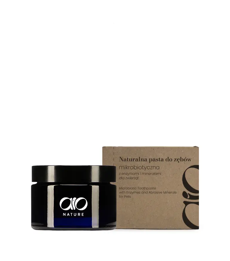 AIO Nature naturalna pasta do zębów mikrobiotyczna z enzymami i minerałami dla zwierząt 50g, która zapobiega powstawaniu kamienia, usuwa płytkę nazębną, nieprzyjemne zapachy oraz zapobiega próchnicy. Dzięki połączeniu wybielającego działania naturalnych enzymów z papai i ananasa oraz minerału ściernego pasta do zębów dla psa doskonale oczyszcza zęby, poleruje szkliwo oraz eliminuje najbardziej uciążliwe przebarwienia, przywracając zębom naturalną biel i blask. Innowacyjny i opatentowany składnik aktywny, pozyskiwany ze skrobi kukurydzianej, zastosowany w paście, odpowiada za regulację mikrobioty w jamie ustnej pupila. Mikrobiom to zbiór mikroorganizmów, które żyją w symbiozie w jamie ustnej psa czy kota. Zmiana tej równowagi może powodować powstawanie patologii w jamie ustnej, w szczególności chorób przyzębia. Składnik ten zwalcza nadmiar szkodliwych bakterii i wspiera odbudowę dobrych, które są potrzebne do zachowania odpowiedniej higieny jamy ustnej. Enzymatyczna pasta do zębów dla psa usuwa nieprzyjemny zapach z pyszczka oraz biofilm, powstający na szkliwie i dziąsłach. To innowacyjne połączenia składników aktywnych sprawia, że codzienne szczotkowanie zębów psa nie będzie potrzebne, bo nasza pasta do zębów dla psa może być stosowana zarówno przy pomocy szczoteczki, jak i palca czy zabawek dentystycznych. Ekstrakt z zielonej herbatyprzyczynia się do zwiększenia gęstości tkanki kostnej, dzięki czemu zęby psa są mocne i zachowują zdrowy wygląd. Węglan wapnia, wykorzystany jako naturalny minerał ścierny w paście, ze względu na swoje właściwości, często wykorzystywany jest w suplementacji psów. Ekstrakt z melisy pomaga w łagodzeniu zapaleń błon śluzowych, aft czy skaleczeń spowodowanych gryzieniem. Pasta zawiera także skrzyp polny, który jest bogaty w witaminy i minerały np. biodostępną krzemionkę, która działa jako środek wybielający. W przypadku wrażliwych na szczotkowanie psów, pastę do zębów dla psów można zaaplikować za pomocą palca na dziąsła i zęby lub na gryzak dentystyczny. Pielęgnacja zębów psa może okazać się dla Was przyjemną zabawą. Aplikując pastę na zabawki z wypustkami, możesz urozmaicać ją dedykowaną psom pastą orzechową, suszonymi warzywami czy ulubionymi smaczkami dentystycznymi. Aromat orzechów arachidowych nadaje nie tylko zapach, ale i smak pasty orzechowej, lubianej i bezpiecznej dla psów i kotów. Nasza naturalna pasta do zębów dla psa oczywiście nie zawiera fluoru.