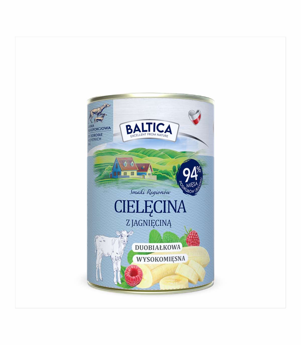 34% cielęcina (23% mięso, 8% serca, 3% wątroba), 34% jagnięcina (25% mięso, 6% serca, 3% wątroba), 26% bulion jagnięcy, 2,5% banan, 2% malina, 1% minerały, 0,5% mięta.