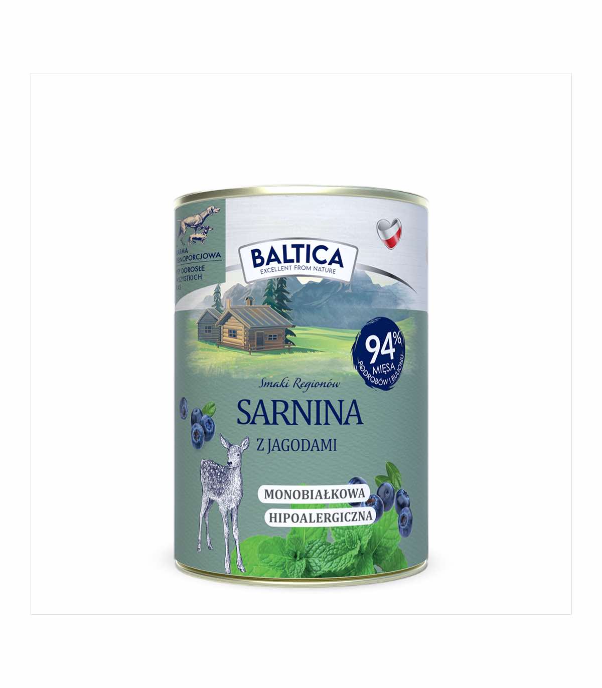 Skład: 94% sarnina (68% mięso, 26% bulion z sarniny), 4% jagoda, 1% minerały, 0,5% jabłko, 0,5% mięta.