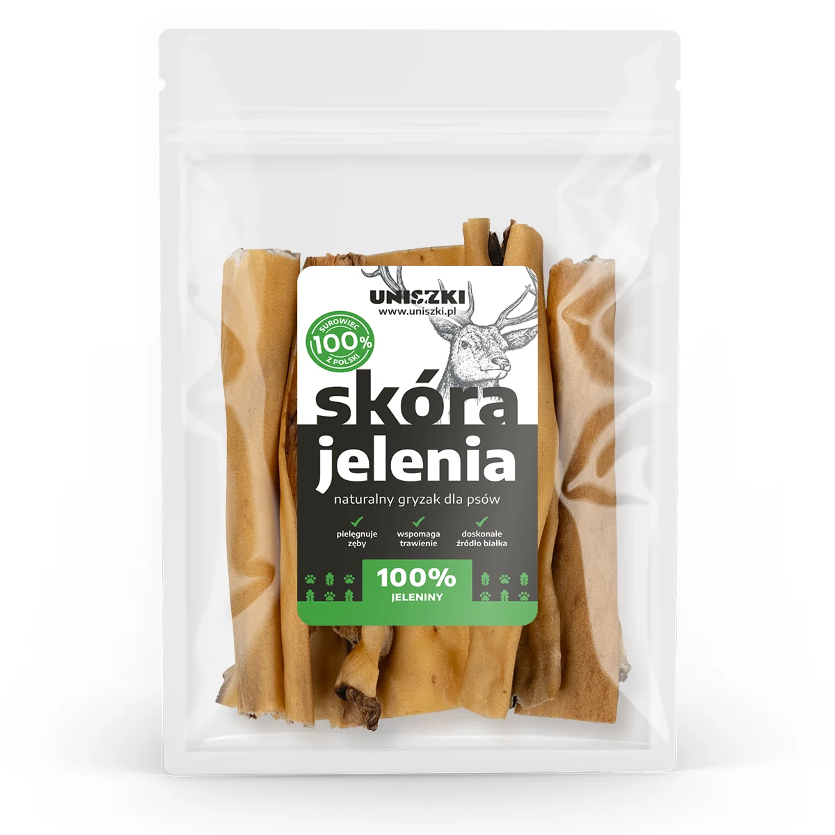 Wiesz, co jest jeszcze twardsze niż beton? Skóra jelenia jako gryzak dla psów! Ta naturalna „przebojowa przekąska” nie tylko zapewnia godziny bezgranicznej zabawy dla Twojego pupila, ale ma również wiele korzyści. Skóra jelenia to prawdziwy trening dla szczęk. Skóra jelenia jest także naturalnym czyszczącym narzędziem dla zębów twojego psa. Kiedy pies gryzie i żuje tę skórę, działa jak szczoteczka do zębów, wycierając się o płytki nazębne i dając twojemu psu świeży oddech. Skóra jelenia to także doskonały gryzak do zaspokojenia psiego instynktu łowieckiego. I co najważniejsze, skóra jelenia jest zdrową przekąską dla Twojego psa. Nie ma w niej żadnych sztucznych dodatków, barwników czy konserwantów.