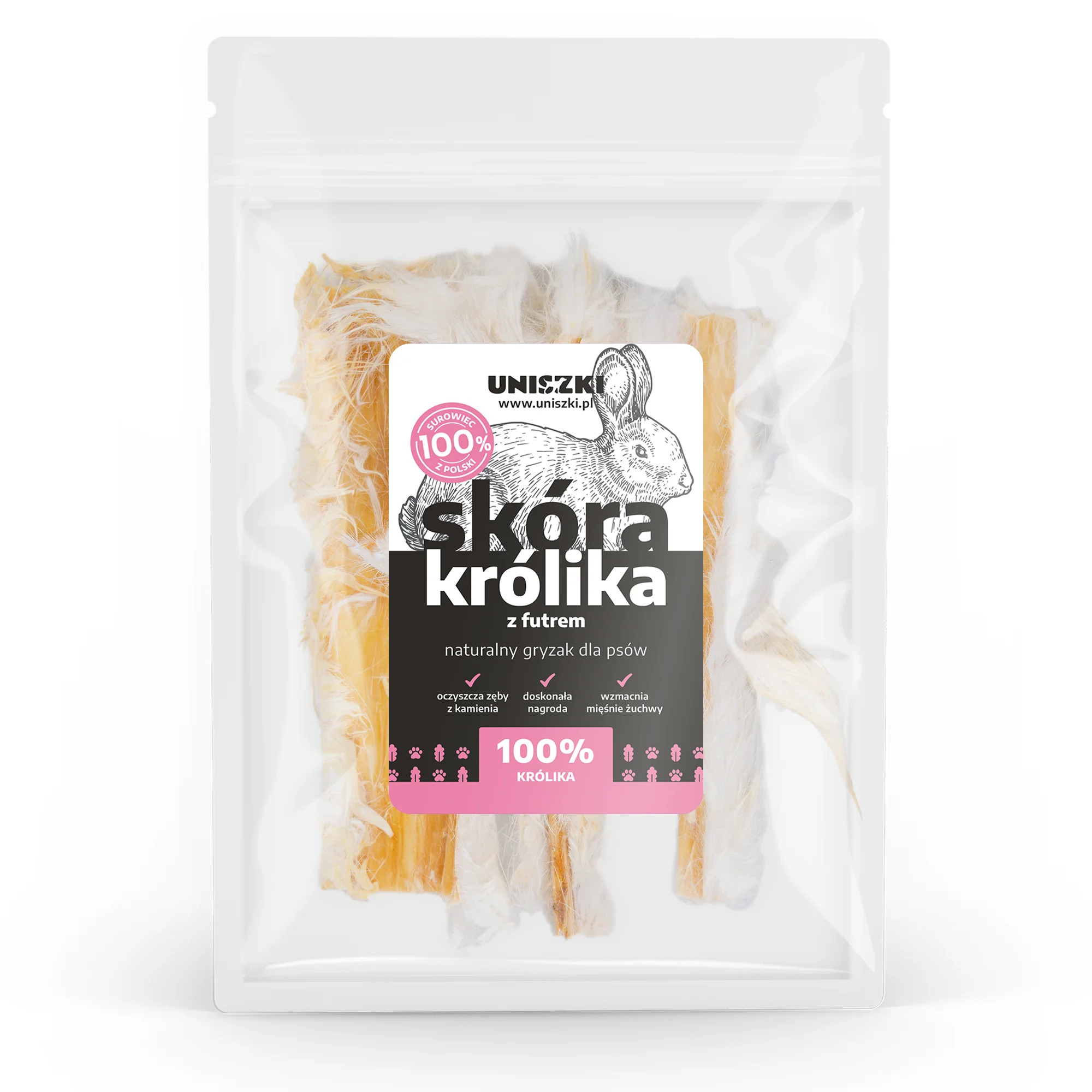 Bogata w białko i naturalne tłuszcze, Skóra królika z futrem jest nie tylko smaczna, ale także wspiera zdrowie skóry i sierści psa, zapewniając mu lśniący i zdrowy wygląd.